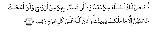 52. La yahillu laka alnnisao min baAAdu wala an tabaddala bihinna min azwajin walaw aAAjabaka husnuhunna illa ma malakat yameenuka wakana Allahu AAala kulli shay-in raqeeban