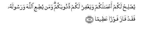 71. Yuslih lakum aAAmalakum wayaghfir lakum thunoobakum waman yutiAAi Allaha warasoolahu faqad faza fawzan AAatheeman