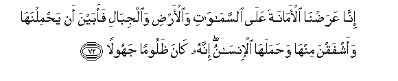 72. Inna AAaradna al-amanata AAala alssamawati waal-ardi waaljibali faabayna an yahmilnaha waashfaqna minha wahamalaha al-insanu innahu kana thalooman jahoolan