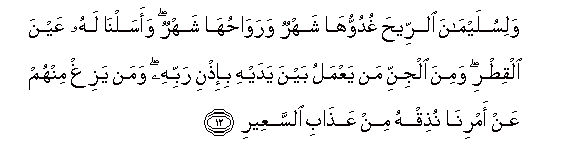 12. Walisulaymana alrreeha ghuduwwuha shahrun warawahuha shahrun waasalna lahu AAayna alqitri wamina aljinni man yaAAmalu bayna yadayhi bi-ithni rabbihi waman yazigh minhum AAan amrina nuthiqhu min AAathabi alssaAAeeri