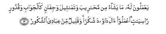 13. YaAAmaloona lahu ma yashao min mahareeba watamatheela wajifanin kaaljawabi waqudoorin rasiyatin iAAmaloo ala dawooda shukran waqaleelun min AAibadiya alshshakooru