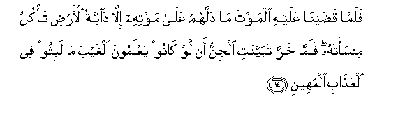 14. Falamma qadayna AAalayhi almawta ma dallahum AAala mawtihi illa dabbatu al-ardi ta/kulu minsaatahu falamma kharra tabayyanati aljinnu an law kanoo yaAAlamoona alghayba ma labithoo fee alAAathabi almuheeni