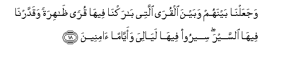 18. WajaAAalna baynahum wabayna alqura allatee barakna feeha quran thahiratan waqaddarna feeha alssayra seeroo feeha layaliya waayyaman amineena