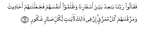 19. Faqaloo rabbana baAAid bayna asfarina wathalamoo anfusahum fajaAAalnahum ahadeetha wamazzaqnahum kulla mumazzaqin inna fee thalika laayatin likulli sabbarin shakoorin