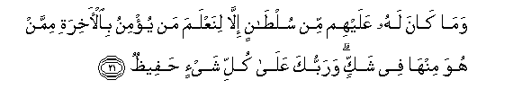 21. Wama kana lahu AAalayhim min sultanin illa linaAAlama man yu/minu bial-akhirati mimman huwa minha fee shakkin warabbuka AAala kulli shay-in hafeethun