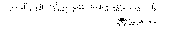 38. Waallatheena yasAAawna fee ayatina muAAajizeena ola-ika fee alAAathabi muhdaroona
