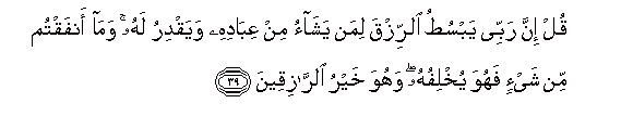 39. Qul inna rabbee yabsutu alrrizqa liman yashao min AAibadihi wayaqdiru lahu wama anfaqtum min shay-in fahuwa yukhlifuhu wahuwa khayru alrraziqeena