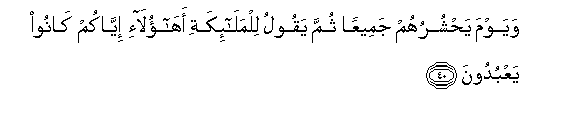 40. Wayawma yahshuruhum jameeAAan thumma yaqoolu lilmala-ikati ahaola-i iyyakum kanoo yaAAbudoona