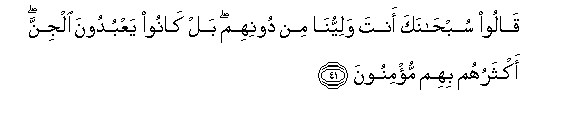 41. Qaloo subhanaka anta waliyyuna min doonihim bal kanoo yaAAbudoona aljinna aktharuhum bihim mu/minoona
