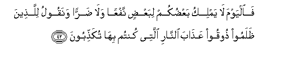 42. Faalyawma la yamliku baAAdukum libaAAdin nafAAan wala darran wanaqoolu lillatheena thalamoo thooqoo AAathaba alnnari allatee kuntum biha tukaththiboona