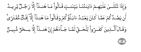 43. Wa-itha tutla AAalayhim ayatuna bayyinatin qaloo ma hatha illa rajulun yureedu an yasuddakum AAamma kana yaAAbudu abaokum waqaloo ma hatha illa ifkun muftaran waqala allatheena kafaroo lilhaqqi lamma jaahum in hatha illa sihrun mubeenun