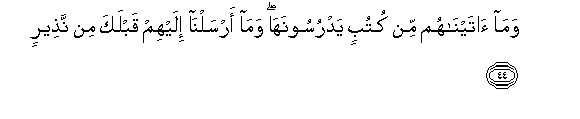 44. Wama ataynahum min kutubin yadrusoonaha wama arsalna ilayhim qablaka min natheerin