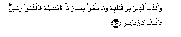 45. Wakaththaba allatheena min qablihim wama balaghoo miAAshara ma ataynahum fakaththaboo rusulee fakayfa kana nakeeri