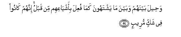 54. Waheela baynahum wabayna ma yashtahoona kama fuAAila bi-ashyaAAihim min qablu innahum kanoo fee shakkin mureebin