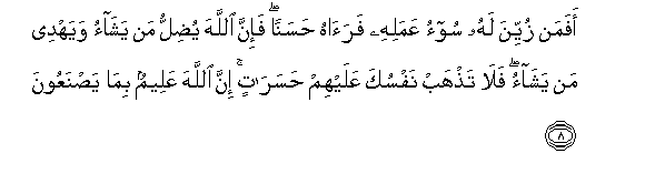 8. Afaman zuyyina lahu soo-o AAamalihi faraahu hasanan fa-inna Allaha yudillu man yashao wayahdee man yashao fala tathhab nafsuka AAalayhim hasaratin inna Allaha AAaleemun bima yasnaAAoona
