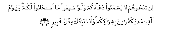 14. In tadAAoohum la yasmaAAoo duAAaakum walaw samiAAoo ma istajaboo lakum wayawma alqiyamati yakfuroona bishirkikum wala yunabbi-oka mithlu khabeerin