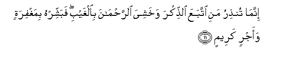 11. Innama tunthiru mani ittabaAAa alththikra wakhashiya alrrahmana bialghaybi fabashshirhu bimaghfiratin waajrin kareemin