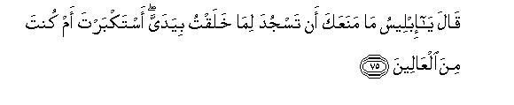 75. Qala ya ibleesu ma manaAAaka an tasjuda lima khalaqtu biyadayya astakbarta am kunta mina alAAaleena