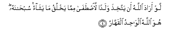 4. Law arada Allahu an yattakhitha waladan laistafa mimma yakhluqu ma yashao subhanahu huwa Allahu alwahidu alqahharu