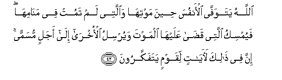 42. Allahu yatawaffa al-anfusa heena mawtiha waallatee lam tamut fee manamiha fayumsiku allatee qada AAalayha almawta wayursilu al-okhra ila ajalin musamman inna fee thalika laayatin liqawmin yatafakkaroona