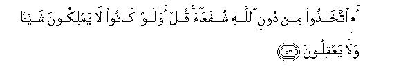 43. Ami ittakhathoo min dooni Allahi shufaAAaa qul awa law kanoo la yamlikoona shay-an wala yaAAqiloona