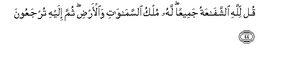 44. Qul lillahi alshshafaAAatu jameeAAan lahu mulku alssamawati waal-ardi thumma ilayhi turjaAAoona