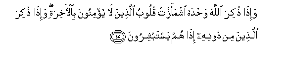 45. Wa-itha thukira Allahu wahdahu ishmaazzat quloobu allatheena la yu/minoona bial-akhirati wa-itha thukira allatheena min doonihi itha hum yastabshiroona