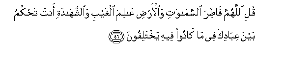46. Quli allahumma fatira alssamawati waal-ardi AAalima alghaybi waalshshahadati anta tahkumu bayna AAibadika fee ma kanoo feehi yakhtalifoona