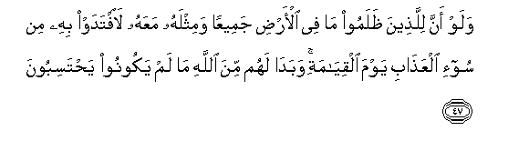 47. Walaw anna lillatheena thalamoo ma fee al-ardi jameeAAan wamithlahu maAAahu laiftadaw bihi min soo-i alAAathabi yawma alqiyamati wabada lahum mina Allahi ma lam yakoonoo yahtasiboona