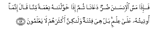 49. Fa-itha massa al-insana durrun daAAana thumma itha khawwalnahu niAAmatan minna qala innama ooteetuhu AAala AAilmin bal hiya fitnatun walakinna aktharahum la yaAAlamoona