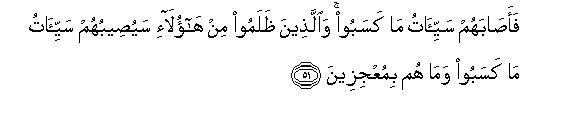 51. Faasabahum sayyi-atu ma kasaboo waallatheena thalamoo min haola-i sayuseebuhum sayyi-atu ma kasaboo wama hum bimuAAjizeena