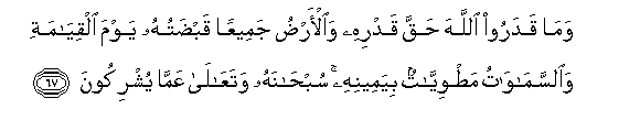 67. Wama qadaroo Allaha haqqa qadrihi waal-ardu jameeAAan qabdatuhu yawma alqiyamati waalssamawatu matwiyyatun biyameenihi subhanahu wataAAala AAamma yushrikoona