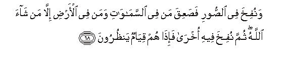 68. Wanufikha fee alssoori fasaAAiqa man fee alssamawati waman fee al-ardi illa man shaa Allahu thumma nufikha feehi okhra fa-itha hum qiyamun yanthuroona