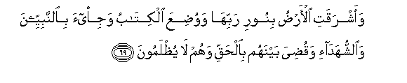 69. Waashraqati al-ardu binoori rabbiha wawudiAAa alkitabu wajee-a bialnnabiyyeena waalshshuhada-i waqudiya baynahum bialhaqqi wahum la yuthlamoona