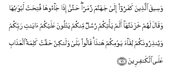 71. Waseeqa allatheena kafaroo ila jahannama zumaran hatta itha jaooha futihat abwabuha waqala lahum khazanatuha alam ya/tikum rusulun minkum yatloona AAalaykum ayati rabbikum wayunthiroonakum liqaa yawmikum hatha qaloo bala walakin haqqat kalimatu alAAathabi AAala alkafireena