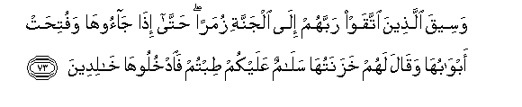 73. Waseeqa allatheena ittaqaw rabbahum ila aljannati zumaran hatta itha jaooha wafutihat abwabuha waqala lahum khazanatuha salamun AAalaykum tibtum faodkhulooha khalideena
