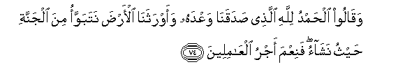 74. Waqaloo alhamdu lillahi allathee sadaqana waAAdahu waawrathana al-arda natabawwao mina aljannati haythu nashao faniAAma ajru alAAamileena