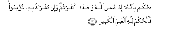 12. Thalikum bi-annahu itha duAAiya Allahu wahdahu kafartum wa-in yushrak bihi tu/minoo faalhukmu lillahi alAAaliyyi alkabeeri