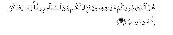13. Huwa allathee yureekum ayatihi wayunazzilu lakum mina alssama-i rizqan wama yatathakkaru illa man yuneebu
