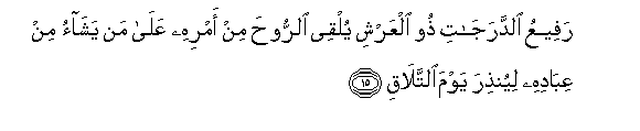 15. RafeeAAu alddarajati thoo alAAarshi yulqee alrrooha min amrihi AAala man yashao min AAibadihi liyunthira yawma alttalaqi