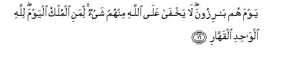 16. Yawma hum barizoona la yakhfa AAala Allahi minhum shay-on limani almulku alyawma lillahi alwahidi alqahhari