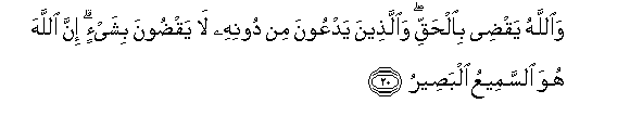 20. WaAllahu yaqdee bialhaqqi waallatheena yadAAoona min doonihi la yaqdoona bishay-in inna Allaha huwa alssameeAAu albaseeru