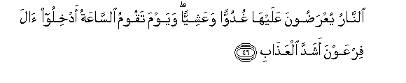 46. Alnnaru yuAAradoona AAalayha ghuduwwan waAAashiyyan wayawma taqoomu alssaAAatu adkhiloo ala firAAawna ashadda alAAathabi