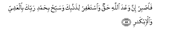 55. Faisbir inna waAAda Allahi haqqun waistaghfir lithanbika wasabbih bihamdi rabbika bialAAashiyyi waal-ibkari
