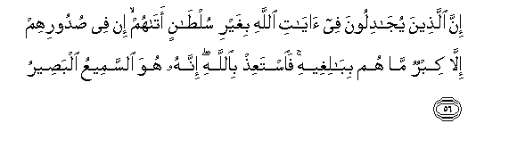 56. Inna allatheena yujadiloona fee ayati Allahi bighayri sultanin atahum in fee sudoorihim illa kibrun ma hum bibaligheehi faistaAAith biAllahi innahu huwa alssameeAAu albaseeru