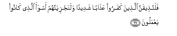27. Falanutheeqanna allatheena kafaroo AAathaban shadeedan walanajziyannahum aswaa allathee kanoo yaAAmaloona