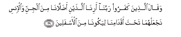 29. Waqala allatheena kafaroo rabbana arina allathayni adallana mina aljinni waal-insi najAAalhuma tahta aqdamina liyakoona mina al-asfaleena