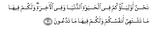 31. Nahnu awliyaokum fee alhayati alddunya wafee al-akhirati walakum feeha ma tashtahee anfusukum walakum feeha ma taddaAAoona