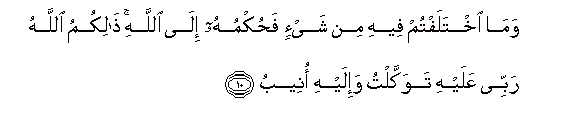 10. Wama ikhtalaftum feehi min shay-in fahukmuhu ila Allahi thalikumu Allahu rabbee AAalayhi tawakkaltu wa-ilayhi oneebu