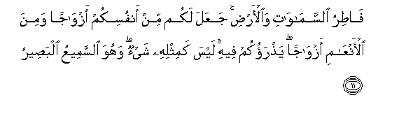 11. Fatiru alssamawati waal-ardi jaAAala lakum min anfusikum azwajan wamina al-anAAami azwajan yathraokum feehi laysa kamithlihi shay-on wahuwa alssameeAAu albaseeru